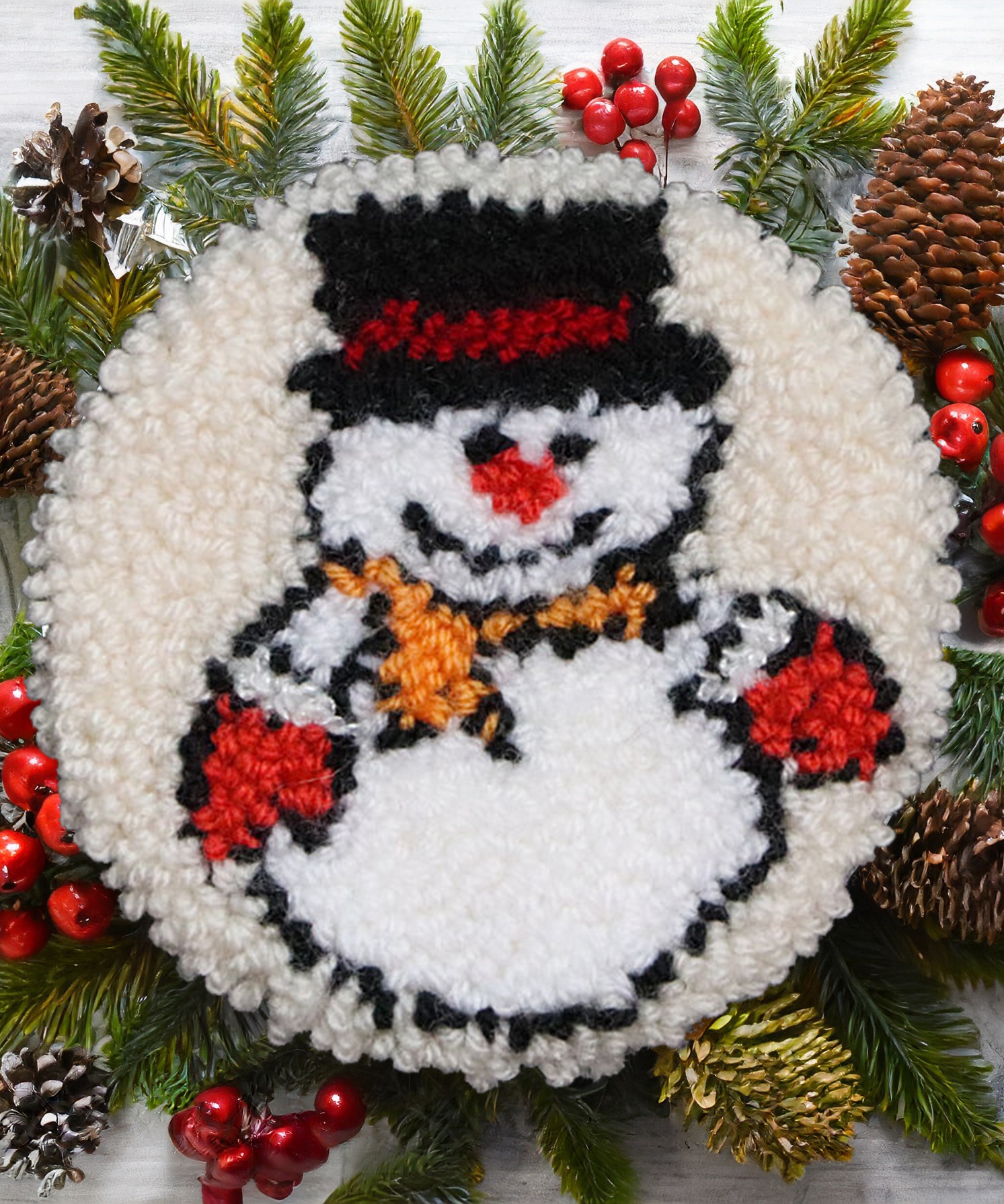 Świąteczna podkładka pod kubek wykonana haftem pętelkowym (punch needle) to oryginalna ozdoba świąteczna z motywem bałwanka.