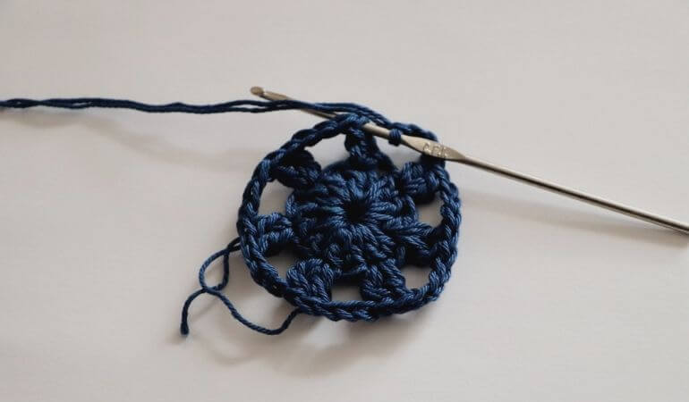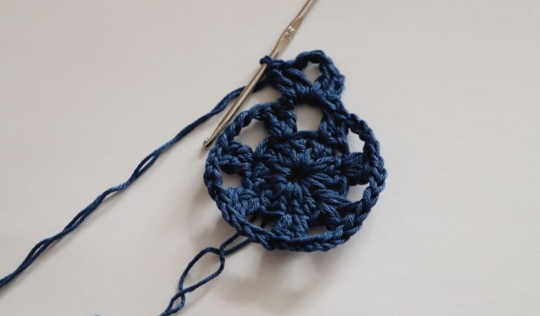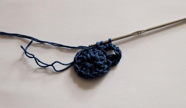Następnie wykonujemy 2 oczka łańcuszka i 1 słupek, potem 3 oczka łańcuszka i 2 słupki.