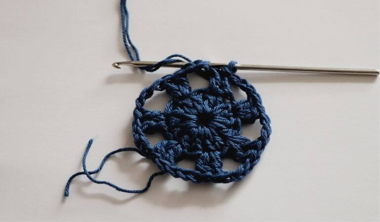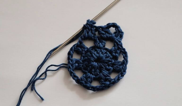W ten sposób przerabiamy 7 razy i łączymy z dwoma oczkami łańcuszka, kończąc w ten sposób trzeci rząd.